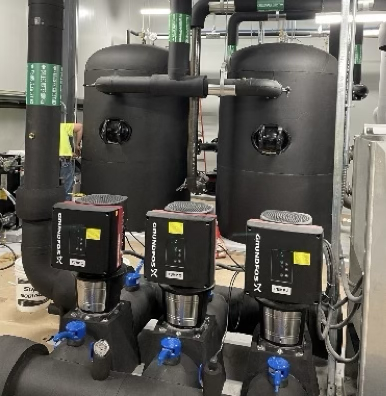 Nearing completion, the scope of our work has been very extensive. We’ve installed (4) 700,000 BTU geothermal heat pumps, served by two 600 GPM geothermal production wells, and three rejection wells that heat and cool the building, provide domestic hot water, and sidewalk snowmelt. The system delivery is state of the art Grundfos integrated pump skids to 135 load match fan coils.